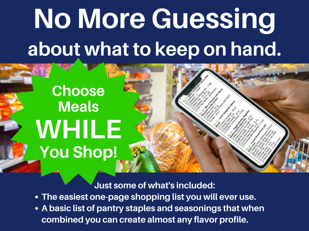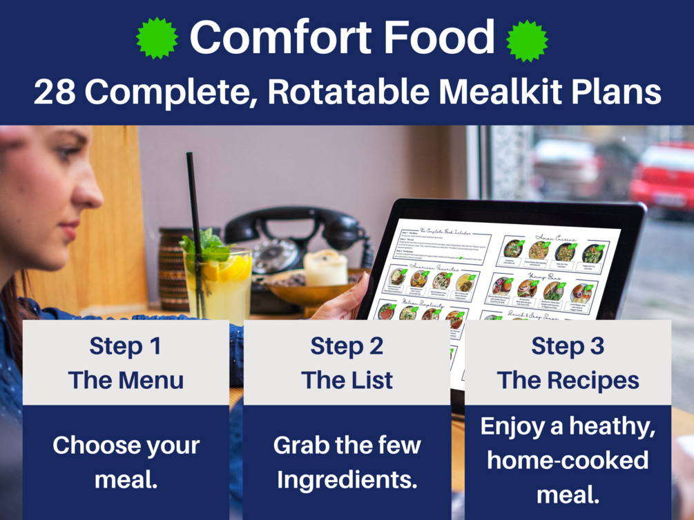 Plant-Based Comfort Foods includes 1.) 28 Complete, Rotatable Mealkit Plans. All recipes are 100% plant-based. Over 65 unique recipes. 2.) A restaurant-style menu for easy, visual meal selections. 3.) The easiest shopping list you will ever use. 4.) Complete recipes conveniently all on one page per meal. No flipping back and forth!